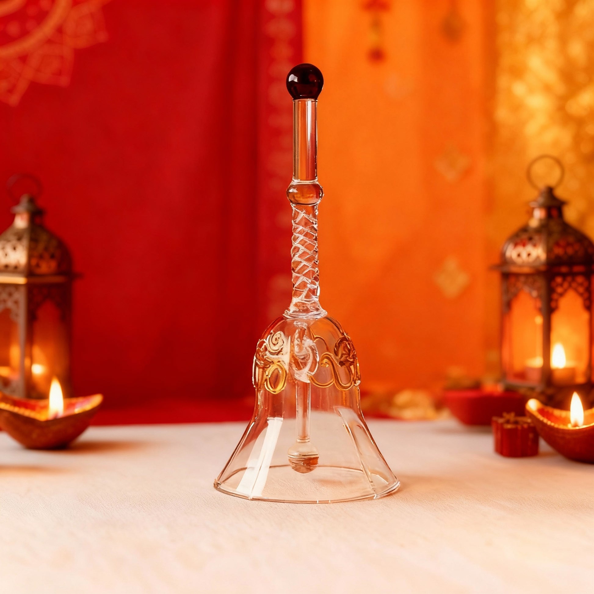 A beautifully handcrafted glass bell with golden detailing, designed to create a clear, soothing chime that enhances your daily puja and meditation rituals.